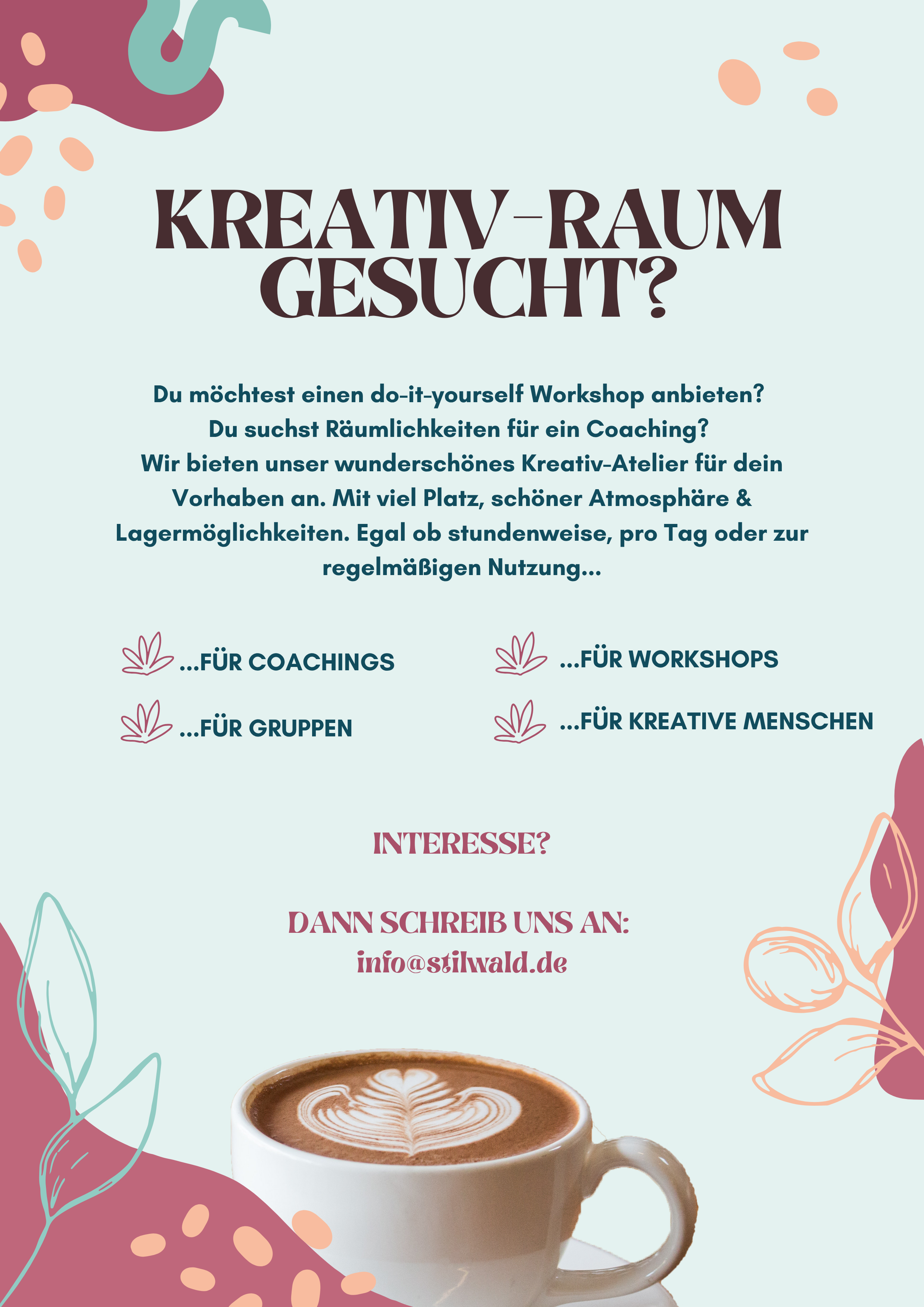 10. November, 2025Kreativ-Raum gesucht? Du möchtest einen do-it-yourself Workshop anbieten? Du suchst Räumlichkeiten für ein Coaching? Wir bieten unser wunderschönes Kreativ-Atelier für...
